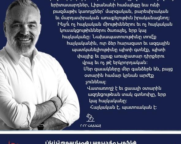 Ոչ հայկական միութիւններու, կուսակցութիւններու եւ կազմակերպութիւններու անդամակցող եւ ծառայող հայ երիտասարդներ, Լիբանանի համայնքը եւս ունի բազմաթիւ կառոյցներ՝ մարզական, բարեսիրական եւ մարդասիրական առաքելութիւն իրականացնող։ Ինչո՞ւ ոչ հայկական միութիւններու եւ ոչ հայկական կուսակցութիւններու ծառայել, երբ կայ հայկականը։ Նախապատուութիւնը տուէ՛ք հայկականին, ուր ձեր հարազատ եւ ազգային պատկանելիութիւնը պիտի գտնէք, պիտի փայլիք եւ ըլլաք առաջատար դիրքերու վրայ եւ ոչ թէ երկրորդական։