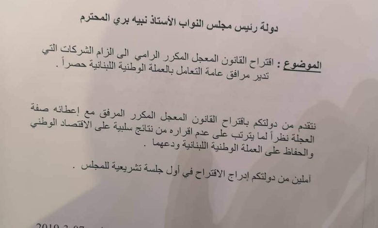 إقتراح قانون يرمي الى إلزام الشركات التعامل بالليرة اللبنانية