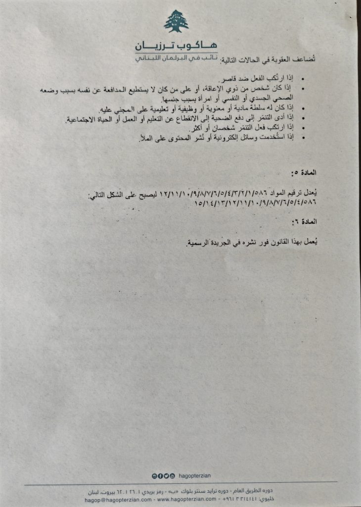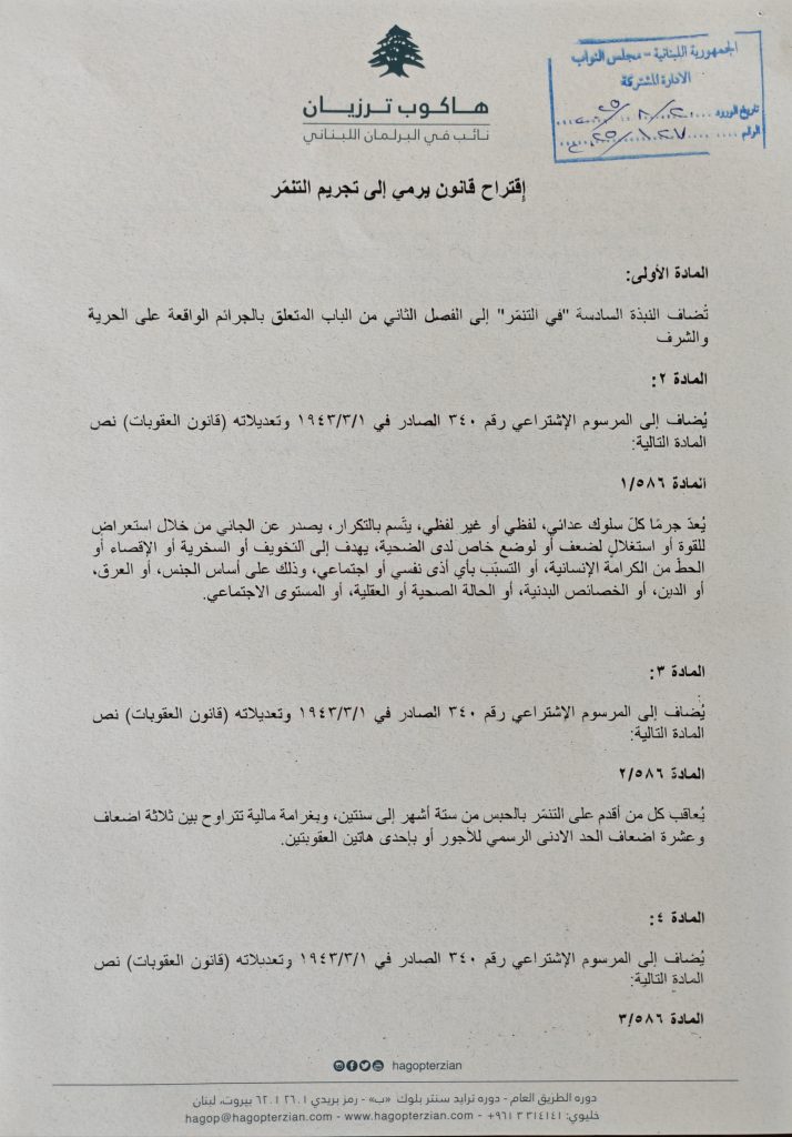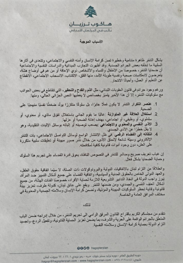 من بعد التشارك والتشاور معكم، أيها الأحبّة، قدّمت اليوم اقتراح قانون تجريم التنمّر، إيمانًا مني بضرورة التصدّي الحازم لهذه الظاهرة المتفاقمة، التي تُهدّد السلامة النفسية والاجتماعية لأبنائنا، وتُمعن في تعميق الجراح داخل مجتمعنا