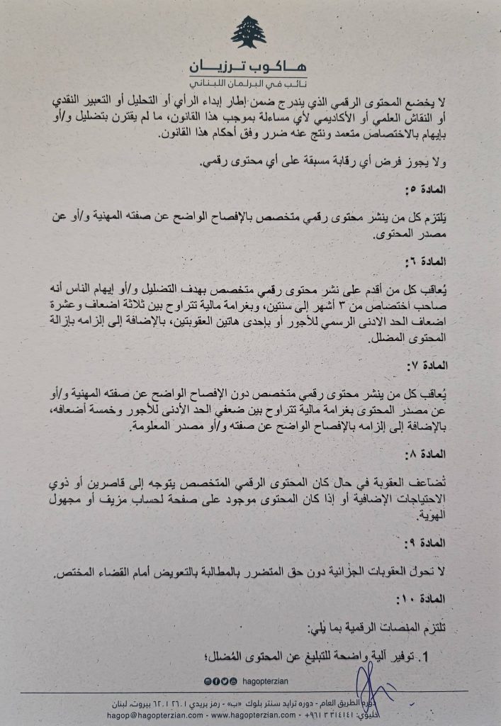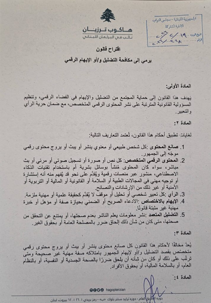 لذلك، تقدّمتُ باقتراح قانون يهدف إلى تنظيم نشر المحتوى الرقمي المتخصص، من خلال إرساء مبدأ الشفافية والإفصاح عن الصفة المهنية ومصدرها، وتحديد المسؤولية القانونية المترتبة على إساءة استعمال هذا النوع من المحتوى، دون المساس بجوهر حرية الرأي والتعبير، وبما ينسجم مع الدستور اللبناني، ولا سيّما المبادئ المتعلقة بالحريات العامة، ومع الالتزامات الدولية التي تعهّد بها لبنان في مجال حقوق الإنسان.