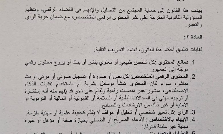 ولما كانت ظاهرة انتشار المعلومات الكاذبة أو المضللة أو الموهِمة، ولا سيّما تلك التي تُقدَّم بصيغة استشارات أو توجيهات متخصصة في المجالات الطبية أو القانونية أو المالية أو التربوية وغيرها من المجالات ذات الأثر العام، وما يترتب عليها من نتائج خطيرة تمسّ بصحة الأفراد وسلامتهم وحقوقهم، فضلًا عن انعكاساتها السلبية على الأمن الاجتماعي والاقتصادي والثقة العامة؛