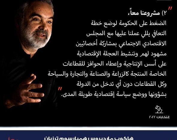 ٢) الضغط على الحكومة ووضع خطة التعافي يللي عملنا عليها مع المجلس الاقتصادي الاجتماعي بمشاركة أخصائيين مشهود لهم وتنشيط العجلة الإقتصادية على أسس الإنتاجية وإعطاء الحوافز للقطاعات الخاصة المنتجة كالزراعة والصناعة والتجارة والسياحة وكل القطاعات دون أي تدخل من الدولة بشؤونها ووضع سياسة إقتصادية طويلة المدى