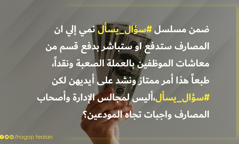 ضمن مسلسل #سؤال_يسأل نمي إلي ان المصارف ستدفع او ستباشر بدفع قسم من معاشات الموظفين بالعملة الصعبة ونقداً، طبعاً هذا أمر ممتاز ونشد على أيديهن لكن #سؤال_يسأل،أليس لمجالس الإدارة وأصحاب المصارف واجبات تجاه المودعين؟