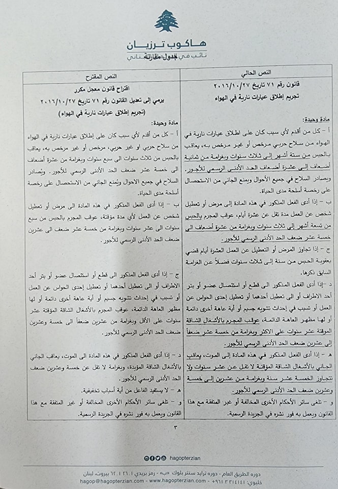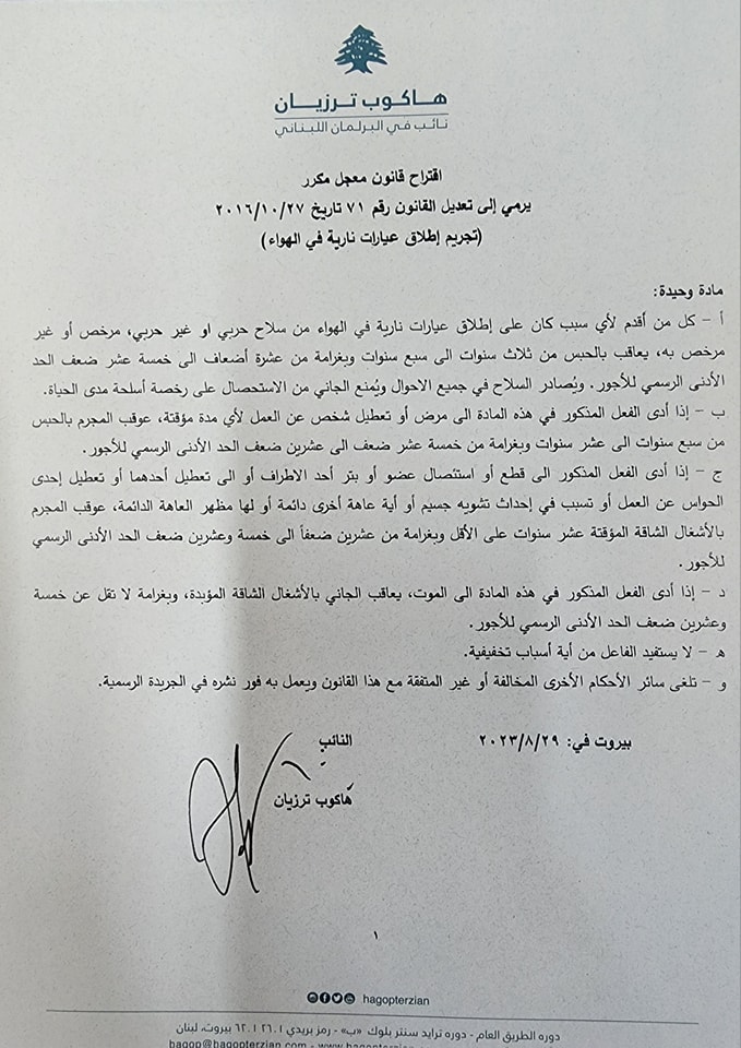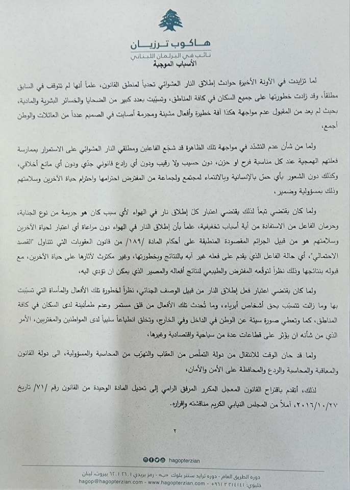 ‏لأننا لا يجب أن نستكين وخاصة أمام أمور تخص المواطن الشريف ولأننا لا يجب أن نقف متفرجين أمام فعلةٍ تهدد مجتمعاتنا جميعاً وثقافتنا اللبنانية ولأنني أؤمن ببناء وطنٍ يتساوى فيه الجميع أمام القانون وكما وعدت،لقد إنتهى الكلام وبدأ فصل المحاسبة لوضع حد لظاهرة أقل ما يقال عنها همجية،سأتقدم بقانون معجل مكرر لتجريم إطلاق النار في الهواء وأترك لكم الحكم لأن مشورتكم ورأيكم بغاية الأهمية عندي.